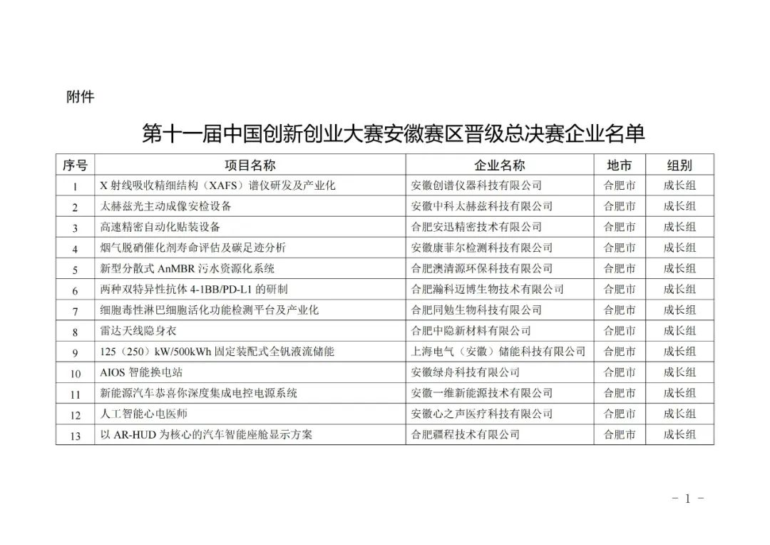 附件:第十一届中国创新创业大赛安徽赛区晋级总决赛企业名单