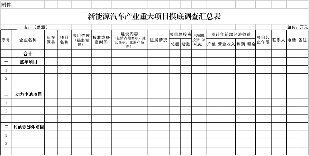 四、报送时间 请各市经信局会同发改等部门对辖区内重点项目进行认真摸排、汇总,填写《新能源汽车产业重大项目摸底调查汇总表》,并于9月10日前反馈省经济和信息化厅。联系人:省经济和信息化厅汽车工业处 王文钰;