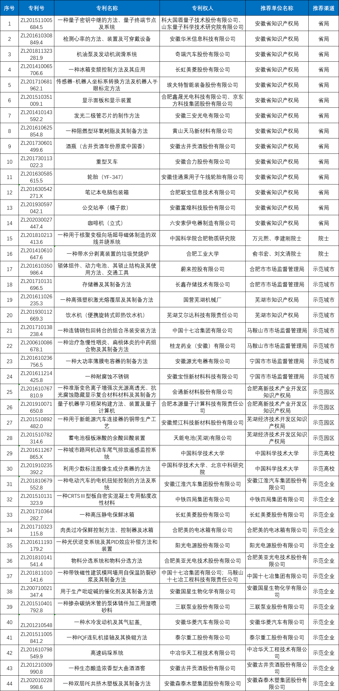 附:第二十三届中国专利奖安徽省拟推荐项目汇总表