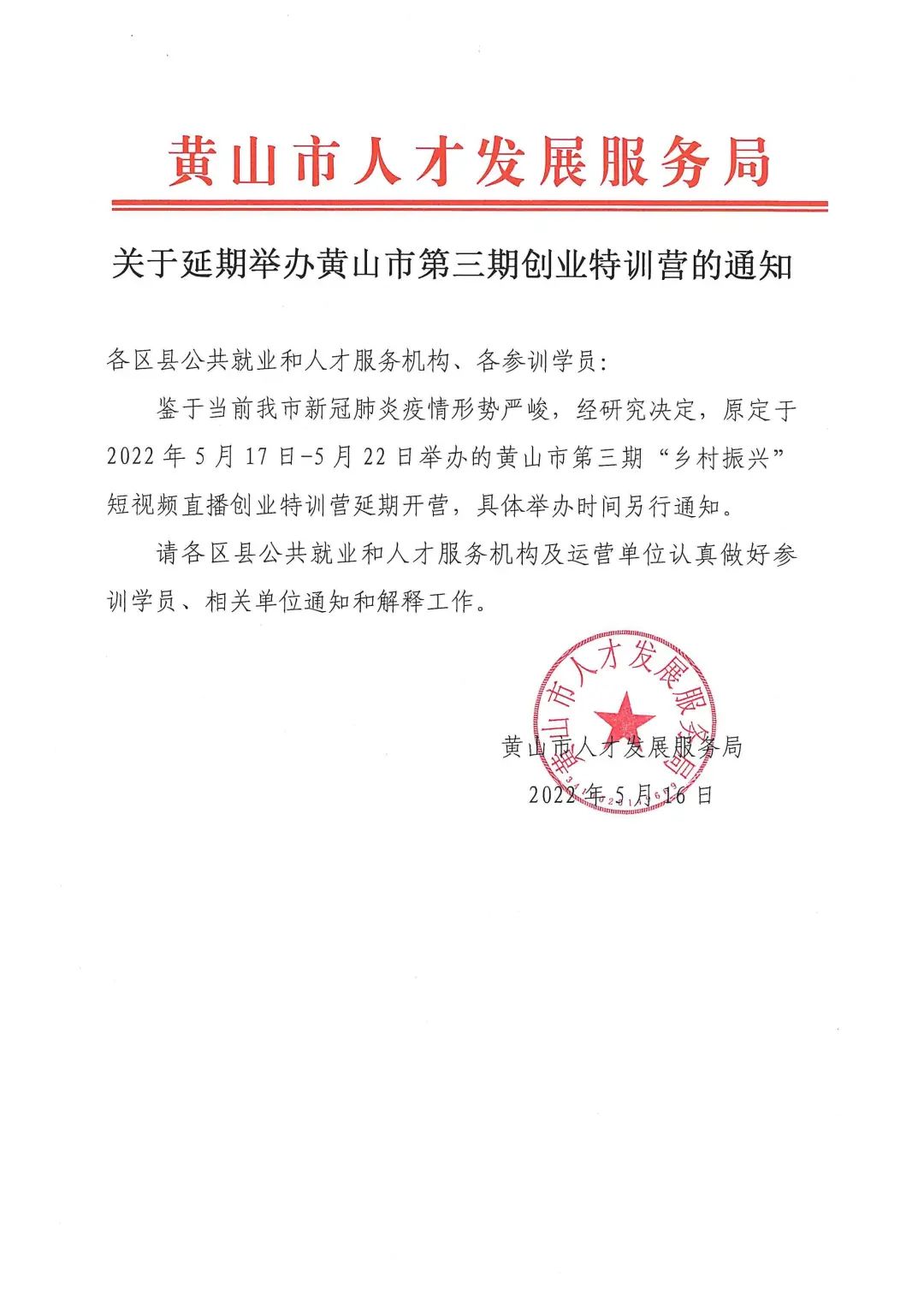 【延期通知】关于延期举办黄山市第三期创业特训营的通知