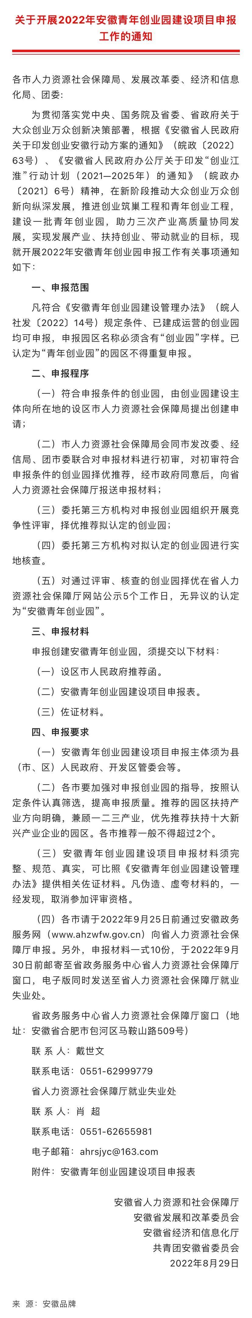 【重要通知】关于开展2022年安徽青年创业园建设项目申报工作的通知