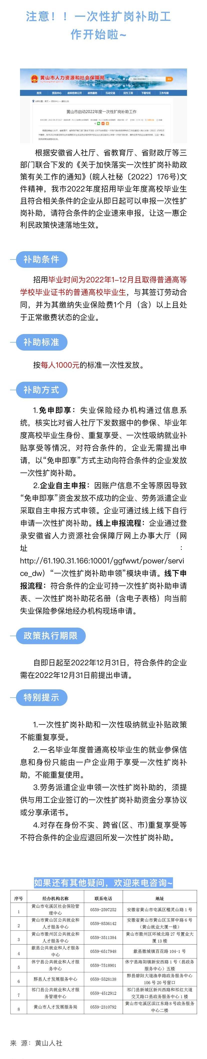 【重要通知】黄山市启动2022年度一次性扩岗补助工作